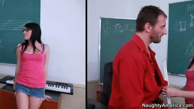 Megan Piper stays after class in her music course so she can get some extra help from Professor Ashley. He regales her of his days past in bands, and it turns her on so much that she starts sucking his cock on and fucking him! But then in walks Professor Knight from the art department. It just so happens that he was Professor Ashley's former bandmate, and now he's goon work with him again to make Megan cum!