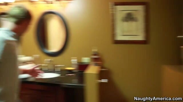 Becca Blossoms needs a towel as she's stepping out of the shower, but little did she know that her son's friend Sonny would be handing her a fresh one! She's startled to see him in her bathroom, inside her own bedroom. When she questions him he doesn't have a good answer for her, so she tells him it's only fair that he remove his clothes since he saw her naked. Sonny does as told, and when he does, the hot MILF makes use of her shower and gets dirty again by fucking her son's friend!