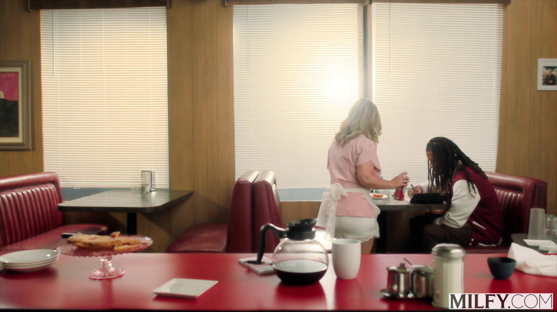 A waitress with an appetite treats a customer to something extra on the house.