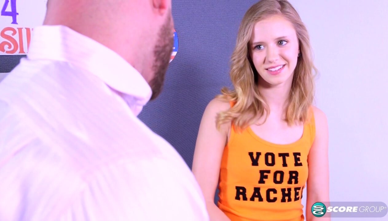 Rachel is running for class president and she wants her teacher to vote for her. She devises a plan to suck and fuck him to get her name on his ballot, but it turns out he isn't allowed to vote. Oh well. She wanted to fuck him anyway! They sneak into the bathroom and we get a bottom-up look at his cock thrusting into Rachel's pretty pussy while both of them are standing. She has one foot on the sink and one hand holding a stall door while teacher grasps her hips and fucks her from behind. If you like flatties, Rachel's tits are about as nonexistent as they get. Her little ass looks perfect as she slides her pussy up and down his shaft, and her face looks oh, so slutty as big globs of cum coat her cheeks and eyelids.