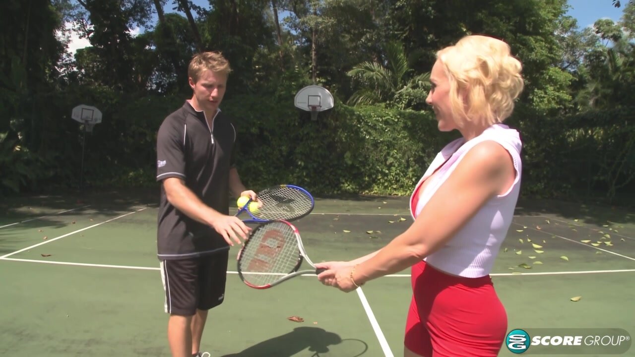Her husband's spent ""big bucks"" to get a tennis pro to come to their house to teach his wife, Raquel, how to play tennis so they can play together at the country club. The pro is dedicated to his task and tries to get Raquel to improve her grip on her racket. But as soon as she knows her husband is gone, she makes it clear that she'd rather concentrate on a different grip - gripping the young pro's cock. After sucking him silly on the tennis court, she takes him into the guesthouse where she shows that she may be a learner at tennis, but she's a pro at sucking and fucking!