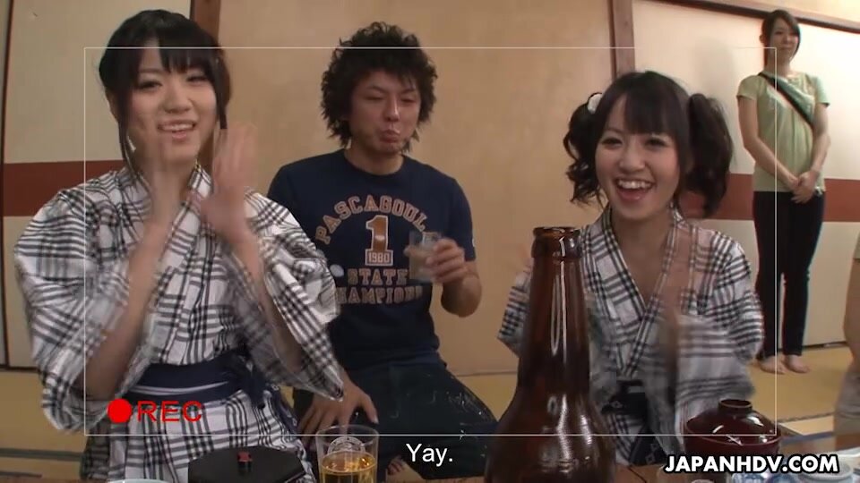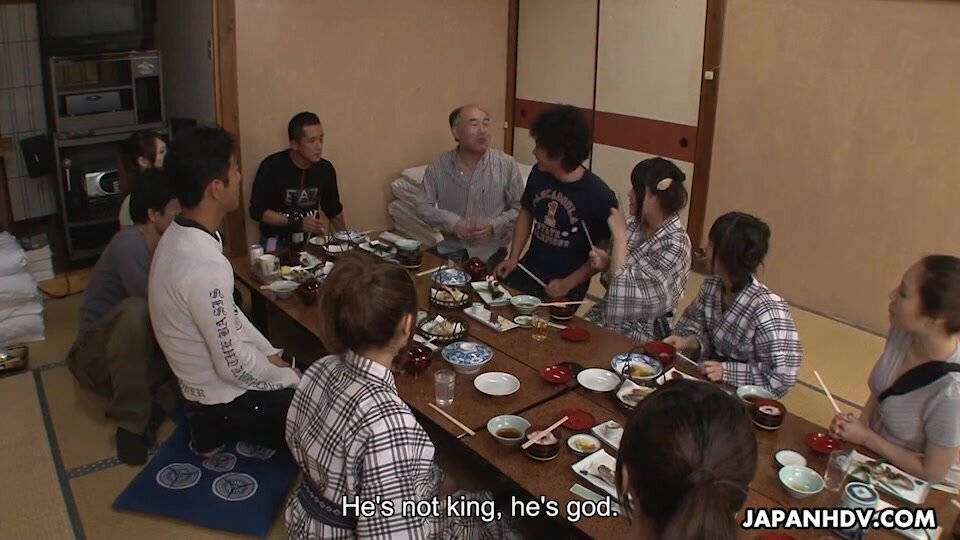 Kotomi Asakura, Reika Sawamura, Kiyoha Himekawa, Tsubaki Housho, Touko Manaka finished shooting a porn movie. They celebrate with the entire production team. One licks a cock, while the other one has her hairy cunt licked and then, fucked from behind