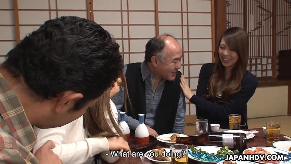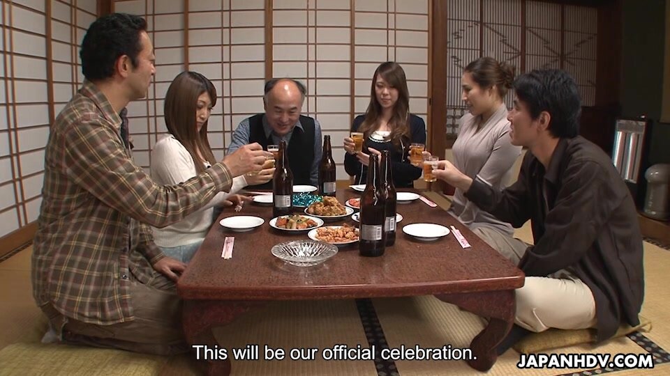 Kiyoha Himekawa, Reika Sawamura and Touko Manaka are having dinner with their neighbors. After some drinks, this dinner transforms into an orgy. They are all pumped from behind and from one side, like in a competition.