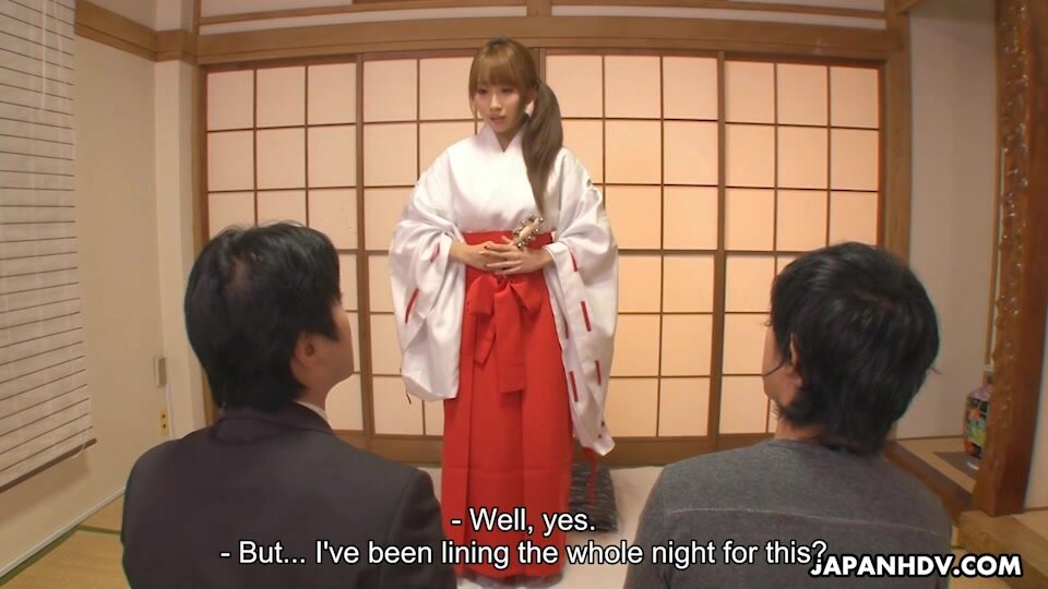 Yui Misaki is a shrine maiden who helps people with her problems. These two men who come to her don't trust that she is a shrine maiden and they start touching, kissing and undressing her of the kimono.