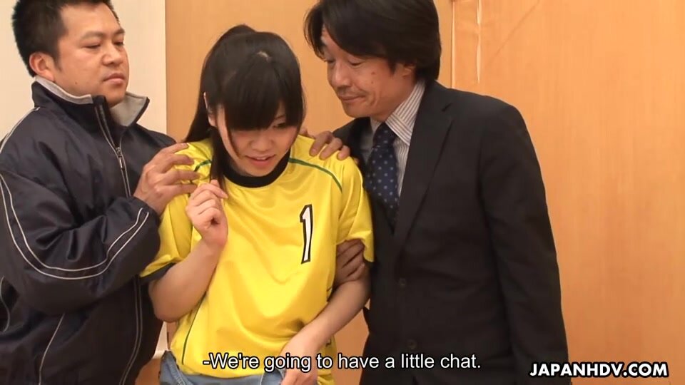 Naughty little soccer chick touches her girlfriend's tits, but she gets caught by two nasty gentleman and she has to pay for this. They show her some really good time. Both of their cocks penetrate that pussy so well and she gets her face creamed.
