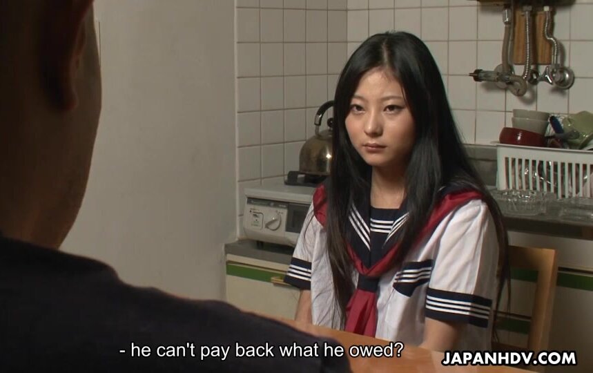 Dark haired and nasty Sayaka enjoys in playing her father's debt with her tight young pussy by getting her clothes off, her eyes blindfolded and her young slit stimulated with a vibrator as she moans and squirts all over the chair in a close up video