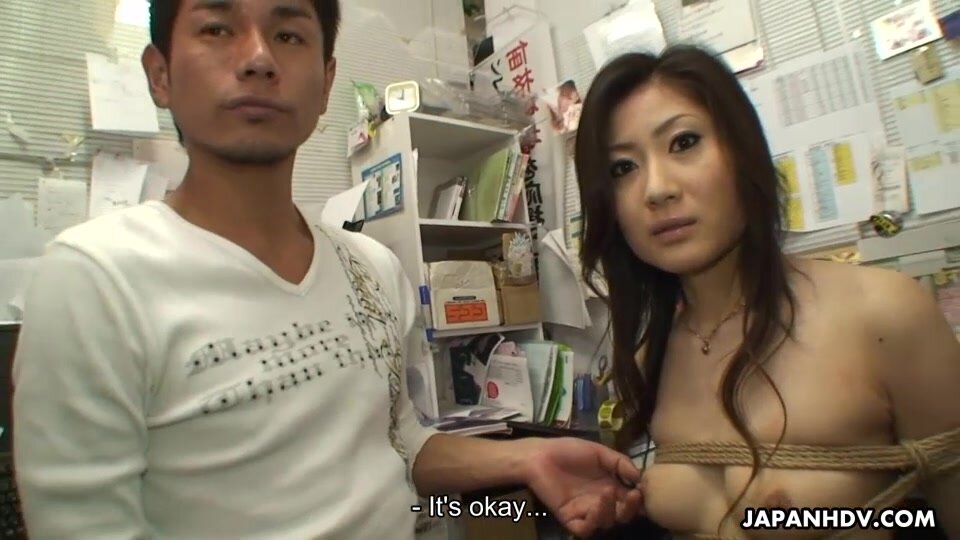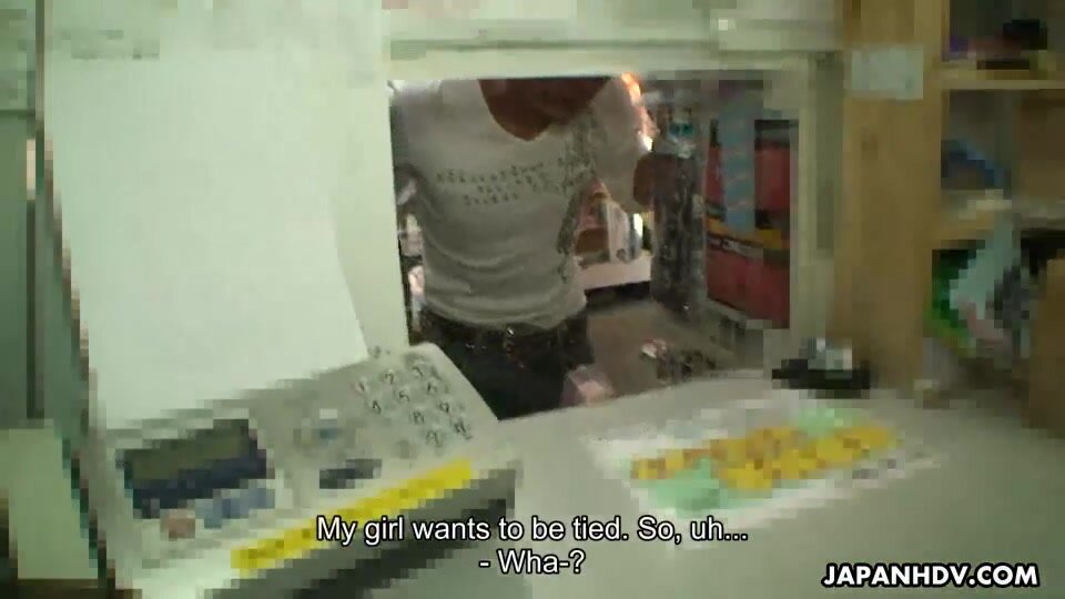 Sexy and arousing Japanese Ryo enjoys in getting tied up in a public place, a shop and then her hairy twat drilled with dildo before she gets her hands on hard boners and starts sucking and licking them or getting pounded by one in a threesome sex