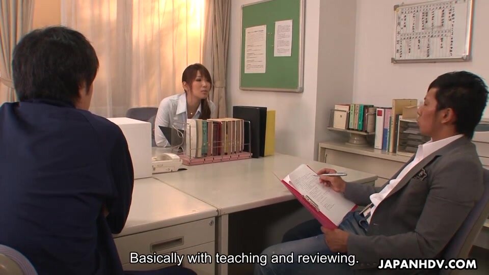 Milf Yuno Hoshi gets into a nasty meeting with two dads and enjoys in seducing them with her fingering, cock wanking and sucking skills in her office, making a hot threesome in front of a camera and pleasing both them and herself during her pounding