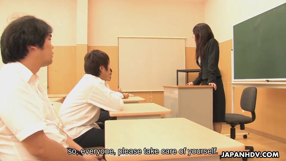 Sexy and arousing dark haired teacher Maho Sawai with glasses gets her black suit taken off and her hairy natural slit rammed pretty hard by a group of her turned on students after the class is over in a nasty group sex session on the desk and moans